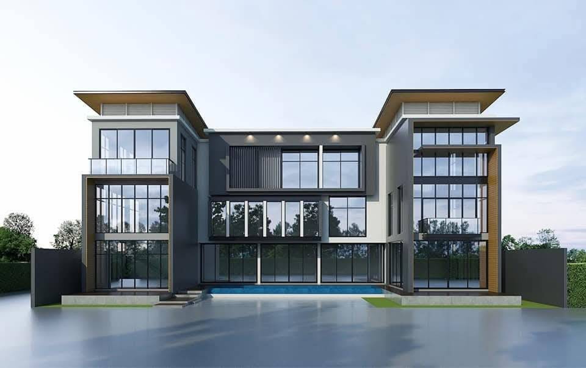 A high-efficiency VRF air-conditioning system was engineered to support a total cooling capacity of 600,000 BTU/h, ensuring stable performance and precise temperature control throughout the entire home. The system utilizes two outdoor condensing units, strategically positioned to minimize visual impact while maximizing operational efficiency.